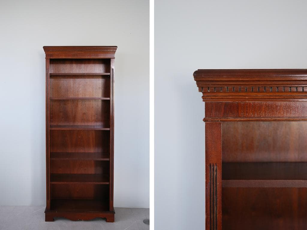 高さ約150cmの木製本棚です。シンプルで落ち着いた佇まいながら、風合いがあり、レトロな空間にもよく馴染みます。本の収納はもちろん、雑貨や食器を飾る棚としてもおすすめです。※シール跡、傷などあります。がたつきやぐらつきなどはなく、使用上の問題はありません。※サイズが大きいため、現状のお写真では細かい部分が確認しづらい部分もあるかもしれません。撮影し画像追加させていただくことも可能です。コメントにてお気軽にお問い合わせください。【材質】木製【サイズ】幅 90.5㎝ 奥行 35㎝ 高さ 150㎝[ご購入を検討される方はプロフィールをご一読ください。]古道具やアンティーク品は経年による、小さなキズや木の反り、色むらなどがある場合がございます。それらを新品にはない味わいとして魅力に感じて頂ける方のみ、ご購入をおすすめいたします。オンライン販売のため、お品物の状態は写真や商品説明にて記載しておりますが、実物とイメージが異なる場合があるかもしれません。気になる点がございましたら、ご購入前にお問い合わせください。その他、不明点等ございましたらお気軽にコメントにてお問合せください*古家具古道具アンティークヴィンテージレトロ