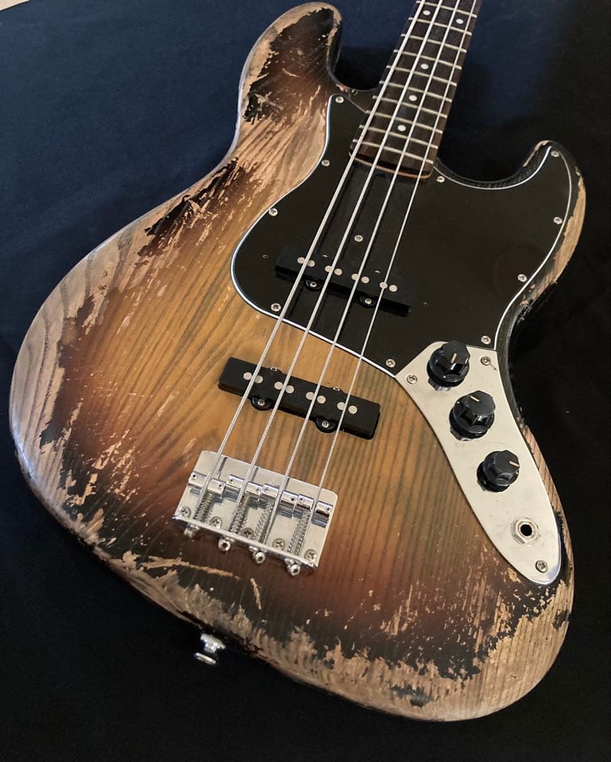 Squire Jazz Bass 5連ペグタイプの希少なモデルです。中古にてデジマートで購入しました。もとから写真では判断が難しい程度の小傷や経年劣化に伴う使用感はありましたが、演奏上は問題ない状態となっています。5連ペグはDeluxe Jazz Bass(アメデラ)モデルで人気ですが、当モデルでも一部製造されていたようです。フレット8割程度残、ネックストレート気味、トラスロッドそれなりに余裕ありです。ピックガードをブラックパールに変えましたが、ネジが一箇所付かなかったため、元の白いピックガードに戻すか、同梱して発送するようにします。ご希望あればお申し付けください。中古品のため完全な綺麗な状態を期待はせず、写真では映りにくいため、ある程度の傷や汚れはある事を承知の上NCNRでお願いいたします。発送時は別のソフトケースになります。出品時価格 ¥73,000